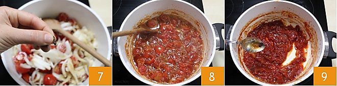 Schließlich fügen Sie auch die Nelken hinzu 7 und lassen Sie alles bei niedriger Hitze für 1 Stunde ab dem ersten Aufkochen köcheln 8, bis Sie eine dicke Mischung erhalten. Beachten Sie, dass die Tomaten nicht vollständig zerfallen sollen. Sobald sie gekocht sind, entfernen Sie die Nelken aus der Mischung 9.