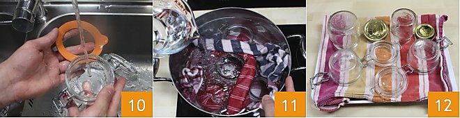 Kümmern Sie sich nun um die Sterilisation der Gläser, in denen Sie Ihr Kirschtomaten-Chutney aufbewahren möchten, indem Sie den Richtlinien des Gesundheitsministeriums folgen, die am Ende des Rezepts aufgeführt sind. Waschen Sie die Gläser gründlich unter Wasser und vergewissern Sie sich, dass keine Risse oder Absplitterungen an der Oberfläche vorhanden sind. Für Gläser mit hermetischem Verschluss waschen Sie auch die Dichtung und legen sie beiseite 10. Füllen Sie einen breiten Topf mit einem sauberen Tuch aus und stellen Sie die Gläser mit der Öffnung nach oben hinein. Legen Sie weitere Tücher um die Gläser, um zu verhindern, dass sie während des Kochens brechen, und füllen Sie den Topf mit Wasser, bis er voll ist 11. Bringen Sie es zum Kochen und lassen Sie es weitere 30 Minuten kochen. Fügen Sie die Deckel zehn Minuten vor dem Abgießen hinzu. Lassen Sie sie abkühlen, dann abtropfen und auf einem Küchentuch verkehrt herum trocknen 12.