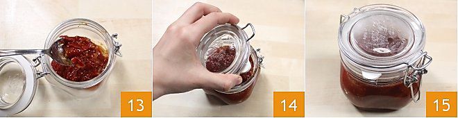 Füllen Sie das noch heiße Kirschtomaten-Chutney in die sterilisierten Gläser 13, wobei Sie mindestens 1 Zentimeter Abstand vom Rand des Glases lassen. Schließen Sie es 14 und bewahren Sie es an einem kühlen und trockenen Ort auf, wobei Sie zuvor sicherstellen, dass das Vakuum korrekt erzeugt wurde 15. Wenn Sie Gläser mit Gummidichtung verwenden, können Sie beim Verzehr des Kirschtomaten-Chutneys den Vakuumtest durchführen, indem Sie an der dafür vorgesehenen Lasche ziehen: Wenn beim Ziehen ein scharfes Geräusch entsteht, bedeutet dies, dass der Inhalt mit korrektem Vakuum konserviert wurde. Andernfalls, wenn die Dichtung beim Ziehen der Lasche „weich“ ist, bedeutet dies, dass das Vakuum nicht korrekt erzeugt wurde und es besser ist, den Inhalt nicht zu essen. Wenn Sie hingegen Gläser mit Drehverschlüssen (Twist-Off) verwenden, schließen Sie sie gut, aber nicht zu fest, und lassen Sie sie abkühlen. Durch die Wärme der Mischung wird ein Vakuum erzeugt, das eine lange Aufbewahrung des Produkts ermöglicht. Sobald die Gläser abgekühlt sind, überprüfen Sie, ob das Vakuum korrekt erzeugt wurde: Sie können auf die Mitte des Deckels drücken, und wenn Sie nicht das typische „Klick-Klack“-Geräusch hören, wurde das Vakuum erzeugt. Sobald Sie überprüft haben, dass die Konservierung erfolgreich war, ist Ihr Kirschtomaten-Chutney bereit, um genossen zu werden!