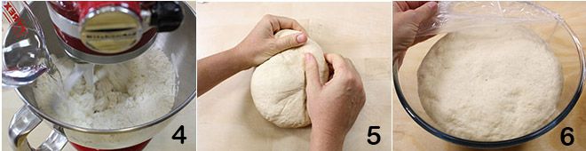 und beginnen Sie mit dem Kneten mit dem Haken, indem Sie das restliche Wasser nach und nach hinzufügen 4. Wenn Sie eine glatte und weiche Konsistenz erreicht haben, wie sie für Brotteig typisch ist, übertragen Sie die Mischung auf eine bemehlte Arbeitsfläche und kneten Sie sie kurz mit den Händen 5. Formen Sie eine Kugel und legen Sie sie in eine Schüssel, abgedeckt mit Frischhaltefolie (oder einem sauberen und feuchten Tuch), und lassen Sie sie dann ein paar Stunden im Ofen ruhen, der ausgeschaltet und geschlossen, aber mit eingeschaltetem Licht ist: Der Teig sollte sein Volumen verdoppeln 6.