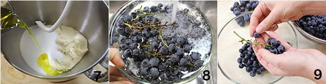 Wenn der Brotteig fertig ist, geben Sie ihn erneut in die Küchenmaschine und kneten ihn mit 50 g Zucker und 4 Esslöffeln Öl für weitere 5 Minuten 7 (wenn Sie möchten, können Sie den gleichen Vorgang auch manuell durchführen, indem Sie den Teig auf einer bemehlten Arbeitsfläche ausbreiten und mit den Händen kneten). Nehmen Sie die Trauben, waschen Sie sie unter fließendem kaltem Wasser 8 und entfernen Sie alle Beeren 9