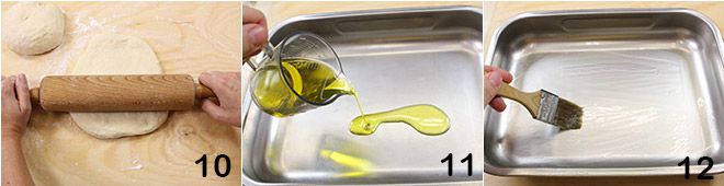 Teilen Sie nun den Brotteig in zwei Teile und rollen Sie beide mit Hilfe eines Nudelholzes aus, bis Sie eine Dicke von 1 cm erreichen 10. Ölen Sie ein Backblech in den Maßen 40 x 30 cm 11, indem Sie einen Pinsel verwenden 12,