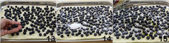 legen Sie dann einen Teigboden darauf und bedecken Sie die gesamte Oberfläche mit der Hälfte der gesamten Traubenmenge 13, einem Esslöffel Zucker 14 und nativem Olivenöl extra 15.