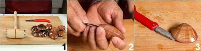 Um die Fasolari zu reinigen und zu verwenden, benötigen Sie ein Messer mit abgerundeter Spitze und dünner Klinge sowie einen Küchenhammer zum Plattieren von Fleisch. Es gibt zwei Arten von Fasolari: eine mit hellerer Schale und eine mit dunklerer Schale; Geschmack und Konsistenz des Fleisches sind jedoch gleich 1. Um die Fasolari richtig zu reinigen, müssen Sie sie öffnen, indem Sie die beiden inneren seitlichen Muskeln einschneiden. Halten Sie sie mit der kürzeren Schalenhälfte nach unten in der Handfläche 2. Führen Sie die Klinge zwischen die beiden Schalenhälften ein, indem Sie mit dem Finger Druck ausüben. Führen Sie die flache Messerspitze bis zum Ende ein 3 und