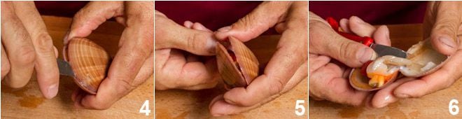 lassen Sie sie seitlich gleiten, wobei Sie darauf achten, die Klinge nach oben geneigt zu halten 4. Üben Sie leichten Druck auf die Schale aus, um sie zu öffnen, drehen Sie die Klinge und schneiden Sie den anderen Muskel seitlich ein (5-6).