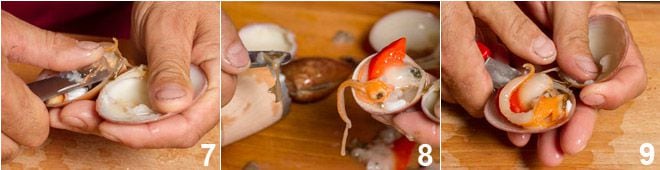 Nun entfernen Sie die gräuliche Haut, die die Frucht bedeckt, und den Darmsack, der kleine Steinchen enthält, die, wenn sie im Inneren bleiben, den Eindruck von Sand im Produkt vermitteln (7-8). Lösen Sie den Fasolaro auch von der unteren Schale 9. Wenn Sie ihn roh verzehren möchten, ist der Fasolaro fertig und Sie können ihn mit etwas Pfeffer oder Zitronensaft würzen, wobei Sie darauf achten, seine Flüssigkeit in der Schale zu behalten.