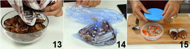 Wenn Sie ihn hingegen gekocht verwenden möchten, sammeln Sie die Flüssigkeit des Weichtieres in einem Schälchen 10, entnehmen Sie die Frucht aus der Schale und legen Sie sie auf ein Schneidebrett. Mit Hilfe eines Fleischhammers wie diesem, weichen Sie das Fleisch des Fasolaro auf, indem Sie auf dem roten Fuß bestehen, bis es dünn, intakt und zart wird (11-12).