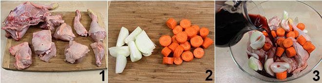 Um Coq au vin zuzubereiten, nehmen Sie das Huhn und schneiden Sie es in Stücke 1, indem Sie den Anweisungen folgen, die Sie hier finden (wie man das Huhn schneidet). Schneiden Sie die Zwiebel in Spalten und die Karotten in Scheiben 2. Legen Sie das geschnittene Huhn in eine ausreichend große Schüssel, fügen Sie die Karotte, die Zwiebel und den Rotwein hinzu, bis es vollständig bedeckt ist 3.