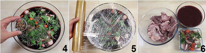 Coq au vin erfordert eine langsame Marinade im Wein, normalerweise ein sehr kräftiger Rotwein, zusammen mit Karotten- und Zwiebelstücken und Aromen. Während des Kochens wird es dann mit Speck und Pilzen angereichert.