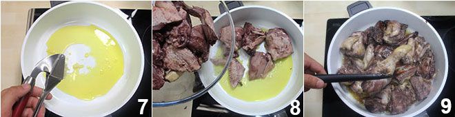 Erhitzen Sie eine Antihaft-Pfanne mit Olivenöl extra vergine und zerdrücken Sie 2 Knoblauchzehen darin 7. Fügen Sie das Huhn hinzu 8 und lassen Sie es auf allen Seiten bei mittlerer Hitze für mindestens 6-7 Minuten gut anbraten. Wenn es gut angebraten ist, nehmen Sie es aus der Antihaft-Pfanne 9 und halten Sie es warm.