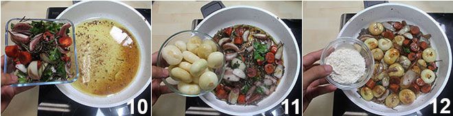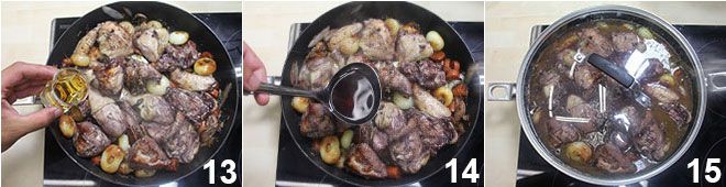 Geben Sie anstelle des Huhns das Gemüse der Marinade in die Pfanne und lassen Sie es 2 Minuten kochen 10. Fügen Sie dann die kleinen Zwiebeln hinzu und lassen Sie sie weitere 3 Minuten kochen 11. Schließlich fügen Sie das Mehl hinzu 12 und lassen Sie den Bratensatz eindicken.