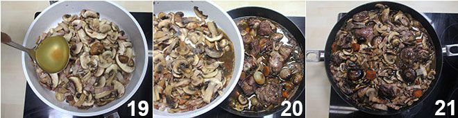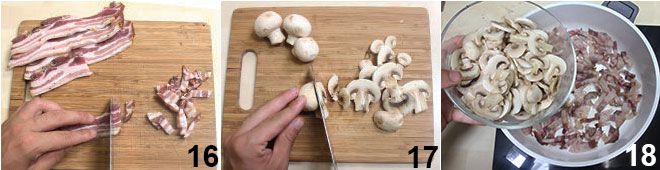 Während das Coq au vin kocht, schneiden Sie den Speck in Streifen 16 und, nachdem Sie sie gereinigt haben, die Pilze in Scheiben 17 (wenn es sehr kleine Pilze gibt, können Sie sie ganz lassen). In einer Antihaft-Pfanne lassen Sie den geschnittenen Speck anbraten und sobald er sein Fett abgibt, fügen Sie die Pilze hinzu und lassen Sie sie etwa 6 Minuten anbraten 18.