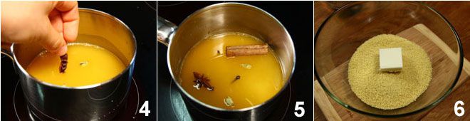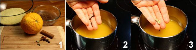 Gießen Sie den Orangensaft und das Wasser in ein kleines Pfännchen und fügen Sie die Nelken 2 und den Kardamom 3 hinzu.