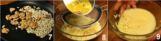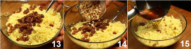 die Rosinen 13 und die gehackten Walnüsse 14; erhitzen Sie den Honig in dem vorherigen kleinen Pfännchen mit einem Schuss Wasser und wenn er gut geschmolzen ist, fügen Sie ihn in einem dünnen Strahl 15 über den Couscous und mischen Sie gut; servieren Sie ihn warm oder auch kalt in kleinen Gläsern oder Schüsselchen.