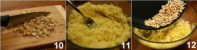 Nach den 5 Minuten lockern Sie den Couscous mit einer Gabel gut auf 11, fügen Sie die Pinienkerne hinzu 12