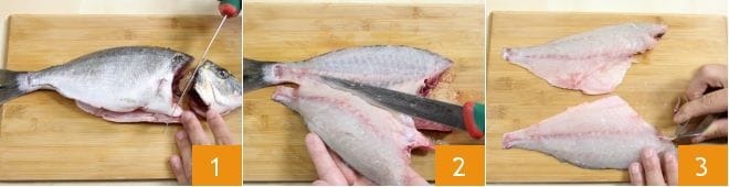 Um den Couscous mit Gemüse und Fischbällchen zuzubereiten, beginnen Sie damit, eine Kartoffel zu kochen. Danach widmen Sie sich dem Reinigen der Goldbrasse: Um diese heikle Aufgabe bestmöglich zu erledigen, konsultieren Sie unsere Kochschule: Goldbrasse reinigen. Nachdem Sie die Goldbrasse ausgenommen und geschuppt haben, entfernen Sie auch die Kiemen. Nehmen Sie ein Fischfiletiermesser und schneiden Sie den Kopf ab 1. Fahren Sie fort, indem Sie den Schwanz und den Rücken entlang der Wirbelsäule einschneiden: Beginnen Sie oben und bewegen Sie die Klinge horizontal zum Arbeitsplatz, um das erste Filet zu erhalten 2. Trennen Sie die beiden Hälften des Fisches und fahren Sie auf die gleiche Weise fort, indem Sie jedoch das Fleisch von den Gräten lösen, um das zweite Filet zu erhalten (achten Sie dabei darauf, nicht zu viel Fleisch zu entfernen). Entfernen Sie alle eventuellen Gräten mit einer Pinzette 3, indem Sie mit der Hand über das Fleisch fahren, um sie zu finden. Entfernen Sie dann die Haut, indem Sie das Messer vorsichtig verwenden, um das Fleisch des Fisches nicht zu verschwenden.