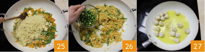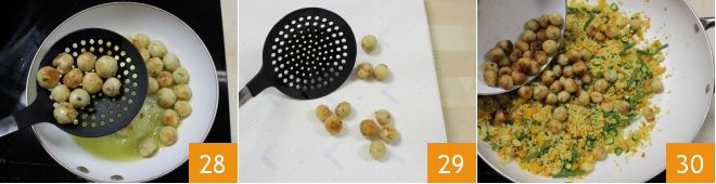 Das Kochen wird recht kurz sein, die Fischbällchen sollen nur goldbraun werden. Wenn die Oberfläche goldbraun ist, heben Sie sie mit einem Schaumlöffel heraus 28 und lassen Sie sie auf einem mit saugfähigem Papier ausgelegten Tablett abtropfen, um das überschüssige Öl zu entfernen 29. Sobald sie trocken sind, geben Sie die Fischbällchen in die Pfanne mit dem Couscous und dem Gemüse 30.