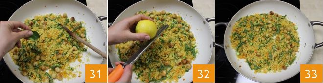 Würzen Sie alles, indem Sie einige Minzblätter hinzufügen 31 und die Schale einer halben Zitrone abreiben 32. Mischen Sie alles und Ihr Couscous mit Gemüse und Fischbällchen ist bereit zum Servieren 33!
