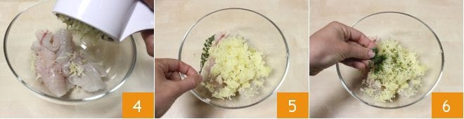 Schneiden Sie das Goldbrassenfleisch in Stücke und legen Sie es in eine Schüssel; Sie benötigen 260 g davon. Wenn die Kartoffel gekocht ist, schälen Sie sie und zerdrücken Sie sie direkt in die Schüssel mit einem Kartoffelstampfer 4. Salzen und pfeffern Sie nach Belieben und fügen Sie die Thymianblätter und die gehackte Petersilie hinzu (5-6).