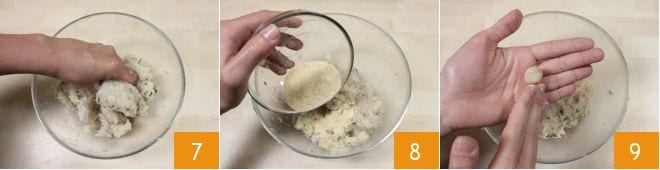 Kneten Sie die Mischung von Hand 7, fügen Sie das Paniermehl hinzu und arbeiten Sie weiter 8. Formen Sie dann Bällchen von etwa 5 g 9.