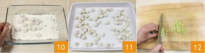 Geben Sie etwas Mehl in eine Schüssel und mehlen Sie die Bällchen darin 10. Anschließend legen Sie sie auf ein Tablett und bewahren Sie sie im Kühlschrank auf, bis Sie sie frittieren müssen 11. Bereiten Sie nun das Gemüse für den Couscous vor: Beginnen Sie damit, den Sellerie gründlich zu waschen und fein zu hacken 12.