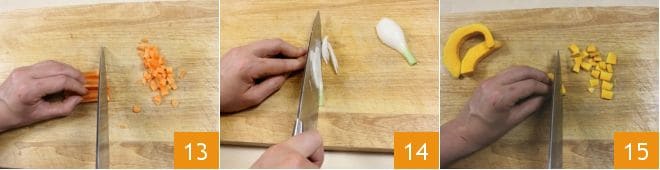 Waschen und schälen Sie eine Karotte mit einem Sparschäler und hacken Sie sie 13. Putzen Sie eine frische Frühlingszwiebel und schneiden Sie sie in Scheiben 14. Entfernen Sie dann die Schale und die inneren Samen vom Kürbis und schneiden Sie ihn in Würfel 15.