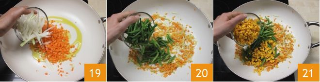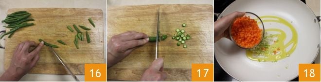 Waschen Sie die grünen Bohnen gründlich unter fließendem Wasser, entfernen Sie die Enden und teilen Sie jede Bohne in drei Teile 16. Schneiden Sie schließlich die Baby-Zucchini in Scheiben, nachdem Sie sie gewaschen und getrocknet haben 17. Nehmen Sie eine große, antihaftbeschichtete Pfanne, geben Sie einen Schuss Öl hinein und fügen Sie den gehackten Sellerie und die Karotten hinzu 18.
