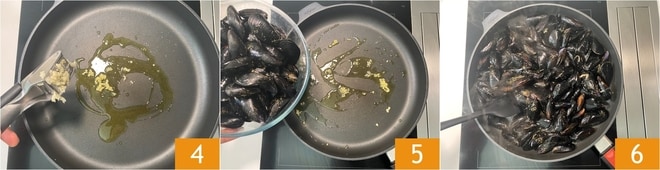 Fügen Sie den ganzen Knoblauch hinzu oder zerdrücken Sie ihn mit dem entsprechenden Werkzeug 4. Erhitzen, lassen Sie es aromatisieren und geben Sie die Muscheln hinzu 5. Mischen Sie 6 und halten Sie das Feuer mittel-hoch.