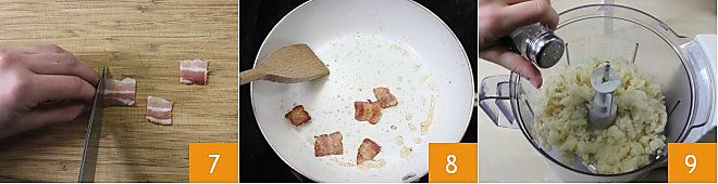 Jede Scheibe Speck in 3 Stücke schneiden, die anderthalb Zentimeter breit sind 7, und für einige Sekunden bei starker Hitze mit einem Spritzer Öl in der Pfanne anbraten 8. Wenn der Speck knusprig geworden ist, die Hitze ausschalten und beiseite stellen. In den Mixer den inzwischen abgekühlten Blumenkohl geben, salzen, den Pfeffer hinzufügen 9