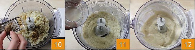 und auch die Muskatnuss 10 hinzufügen. Alles für einen Moment mixen und dann auch die Sahne hinzufügen 11 und mixen, bis eine cremige Konsistenz erreicht ist 12.