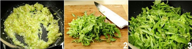 Um die Cremesuppe aus Kopfsalat vorzubereiten, putzt und hackt die Schalotte und die Frühlingszwiebeln, einschließlich des zartesten grünen Teils. In einem großen Topf das Öl und die Butter schmelzen, dann die Schalotte und die Frühlingszwiebeln hinzufügen und bei niedriger Hitze 10-15 Minuten dünsten lassen, ohne dass sie Farbe annehmen. In der Zwischenzeit die Salatblätter vom Strunk lösen, die äußeren, beschädigten Blätter entfernen und die restlichen gut mit kaltem Wasser waschen, um alle Erdreste zu entfernen. Schneidet die Kopfsalatblätter in feine Streifen 2 (um das Video zur Chiffonade-Technik zu sehen, klicken Sie hier) und gebt sie zu den Frühlingszwiebeln in den Topf 3.