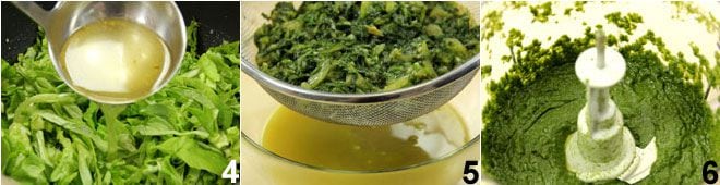 Lasst alles ein paar Minuten kochen, dann 500 ml heiße Gemüsebrühe 4 hinzufügen und bei niedriger Hitze etwa 20 Minuten weiterkochen, salzen und pfeffern. Nach der angegebenen Zeit den Kopfsalat abseihen 5, dabei die Kochflüssigkeit aufbewahren, und den Kopfsalat zu einer feinen Creme pürieren 6.