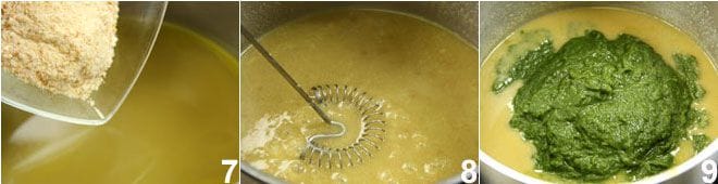 30 g Semmelbrösel zur Kochflüssigkeit hinzufügen 7, die Mischung sanft kochen lassen und mit einem Kochlöffel rühren, bis sie eindickt 8. Dann alles durch ein Sieb in einen Topf gießen (um mögliche Klumpen zu vermeiden), die Kopfsalatcreme hinzufügen 9 und alles vermischen. Je nach gewünschter Konsistenz mehr heiße Gemüsebrühe hinzufügen.