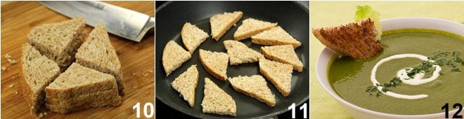 Schneidet das Brot in Dreiecke 10 (auch Toastbrot ist geeignet) und röstet es 11 ohne Fett in einer heißen, antihaftbeschichteten Pfanne von beiden Seiten. Die Cremesuppe in Teller gießen, mit den Brotcroûtons, Joghurt oder saurer Sahne und gehackter Petersilie oder Schnittlauch 12 garnieren und servieren.