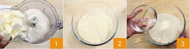 Um die salzige Torte mit Gruyère-Creme und Radicchio zuzubereiten, beginnen Sie mit der Zubereitung des Mürbeteigs: Geben Sie das gesiebte Mehl und die kalte Butter in Stückchen in eine Küchenmaschine 1, schalten Sie das Gerät ein und mixen Sie alles, bis eine sandige Konsistenz entsteht 2. Nehmen Sie das Wasser, das kalt aus dem Kühlschrank sein sollte, und fügen Sie es nach und nach zur Butter-Mehl-Mischung hinzu 3.