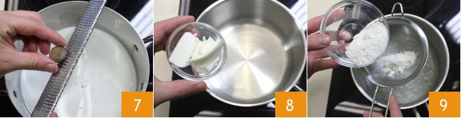 und fügen Sie geriebene Muskatnuss hinzu 7. In einem separaten kleinen Topf schmelzen Sie 70 g Butter 8, dann fügen Sie nach und nach das gesiebte Mehl hinzu 9. Lassen Sie alles für einige Minuten kochen, dabei ständig rühren.