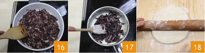 Kochen Sie alles, bis die Flüssigkeit vom Radicchio vollständig aufgesogen ist 16. Wenn der Radicchio fertig ist, fügen Sie ihn zur Gruyère-Creme hinzu und rühren Sie alles gut um 17. Legen Sie nun eine runde Keramik-Tortenform mit einem Durchmesser von 22-24 cm und einer Höhe von etwa 6 cm mit zuvor angefeuchtetem Backpapier aus, nehmen Sie den Mürbeteig aus dem Kühlschrank und rollen Sie ihn mit einem Nudelholz zu einem dünnen Blatt aus 18.