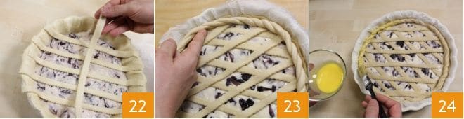 Legen Sie die Streifen über die Füllung, um das typische Gitter der Torte zu formen 22, und formen Sie auch die oberen Ränder, indem Sie zwei Teigstreifen miteinander verdrehen 23. Verquirlen Sie ein Eigelb mit einer Gabel und bestreichen Sie die Oberfläche der Torte damit 24, dann backen Sie alles für 40-45 Minuten im vorgeheizten statischen Ofen bei 180°. Ihre salzige Torte mit Gruyère-Creme und Radicchio ist fertig... Guten Appetit!