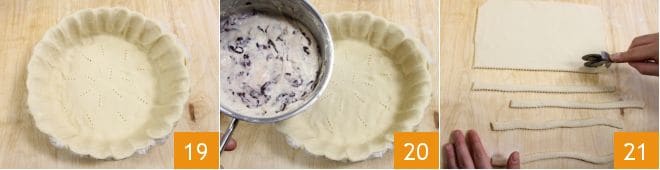 Legen Sie den Mürbeteig in die Tortenform, schneiden Sie den Überschuss mit einem Messer ab und stechen Sie ihn leicht mit den Zinken einer Gabel ein 19. Füllen Sie die Füllung ein, die mittlerweile abgekühlt ist 20, und formen Sie mit dem restlichen Teig Streifen mit einem gezackten Teigrad 21.