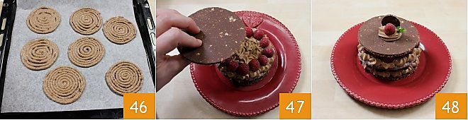 Die Schokoladen- und Himbeerherzchen sind sehr elegante und raffinierte Desserts und Sie können sie auch bei einem wichtigen Abendessen anbieten. In diesem Fall können Sie dem Dessert die Form geben, die Sie möchten, rund, quadratisch oder rechteckig. Sie müssen nur einen Ausstecher in der gewünschten Form verwenden, um die Dacquoise-Basen zu machen (wir haben einen Ausstecher mit einem Durchmesser von etwa 10 cm verwendet) 46 und das Praliné entsprechend zuschneiden und dann das Dessert wie oben zusammensetzen, mit einer Praliné-Basis, einer Dacquoise in der Mitte und einer letzten Praliné-Basis, alles unterbrochen von Buttercremetupfen und Himbeeren (47-48). Auf diese Weise erhalten Sie immer vier Desserts, um alle zu überraschen.