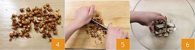 Legen Sie die karamellisierten Haselnüsse auf eine Silikonmatte und trennen Sie die Haselnüsse voneinander 4. Verwenden Sie dazu einen Holzspieß, um sich nicht die Hände zu verbrennen. Dies muss sehr schnell geschehen, sonst lassen sich die Haselnüsse nicht mehr trennen. Nach dem Abkühlen hacken Sie sowohl die gerösteten als auch die karamellisierten Haselnüsse mit einem Küchenmesser 5 oder, wenn Sie möchten, mit einem Mixer (je nachdem, ob Sie größere oder kleinere Haselnussstücke bevorzugen). Nun zerkrümeln Sie in einer Schüssel mit den Händen grob die Waffeln 6 und