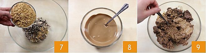 fügen Sie die gehackten Haselnüsse hinzu 7. Mischen Sie ein wenig mit den Händen, damit die Creme der Waffeln etwas schmilzt und sich die Zutaten miteinander verbinden. Schmelzen Sie die Gianduja-Schokolade in der Mikrowelle oder über einem Wasserbad 8 und fügen Sie sie der Mischung aus Waffeln und Haselnüssen hinzu. Gut mischen 9: Die Mischung sollte weich und fest sein.
