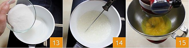 Bereiten Sie währenddessen die Schokoladenbuttercreme zu: Beginnen Sie, indem Sie in einem Topf mit dickem Boden den Zucker mit dem Wasser 13 geben und bei schwacher Hitze ab und zu mit einem Stahl-Löffel umrühren. Sobald sich der Zucker aufgelöst hat, nicht mehr rühren und mit einem Lebensmittelfieberthermometer messen, dass der Sirup 121°C erreicht 14. In der Zwischenzeit geben Sie die Eigelbe in eine Küchenmaschine, oder verwenden Sie die Rührbesen eines elektrischen Mixers und schlagen Sie sie bei mittlerer Geschwindigkeit 15, um eine helle und schaumige Mischung zu erhalten.