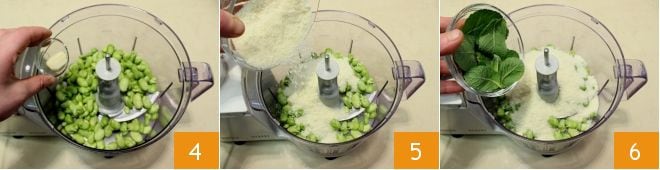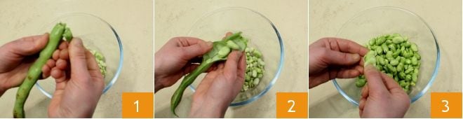 Um das Bohnenpesto zuzubereiten, beginnen Sie mit ihrer Reinigung, dann schälen Sie sie und entfernen Sie die härtere äußere Schale (1-2); achten Sie darauf, auch die Haut zu entfernen, die sie umhüllt 3.
