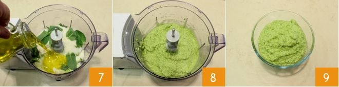 und das Öl in einem dünnen Strahl 7. Schalten Sie den Mixer ein und mixen Sie alles in Intervallen, indem Sie sich nach wenigen Sekunden regelmäßig unterbrechen (um die Klingen nicht übermäßig zu erhitzen), bis Sie eine cremige und homogene Mischung erhalten 8; geben Sie das erhaltene Bohnenpesto in eine kleine Schüssel 9 und wenn Sie es nicht sofort verwenden, können Sie es mit Frischhaltefolie abdecken oder mit nativem Olivenöl extra. Verwenden Sie es, um leckere Hauptgerichte zu würzen!