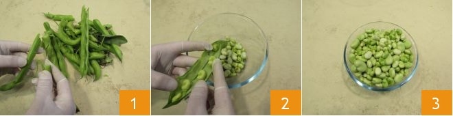 Um den Dicke-Bohnen-Salat zuzubereiten, beginnen Sie damit, die Hülsen zu putzen 1. Werfen Sie sie nicht weg, denn Sie könnten ein schmackhaftes Pfannengericht aus Dicken-Bohnen-Schalen daraus machen. Falls Sie möchten, können Sie Handschuhe tragen, um die Bohnen zu schälen. Sobald die Hülsen geöffnet sind, schälen Sie sie 2 und sammeln Sie die Bohnen in einem Behälter 3.