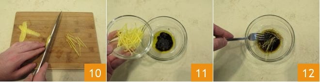 und dann in dünne Streifen schneiden 10, fügen Sie sie zu dem Öl in der Schüssel hinzu 11 und emulgieren Sie alles kurz mit einer Gabel 12.