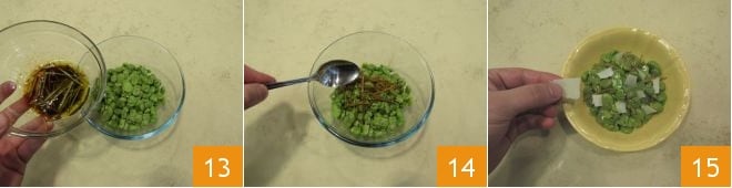 Gießen Sie schließlich die Sauce in die Schüssel mit den Dicke-Bohnen-Samen 13, mischen Sie 14 und richten Sie alles auf einem Servierteller an, auf dem Sie die Käsespäne hinzufügen, um den Dicke-Bohnen-Salat noch mehr zu würzen 15.