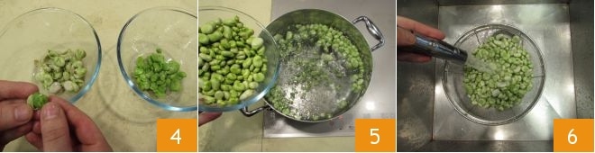 Stellen Sie einen Topf mit Wasser auf den Herd und bringen Sie es zum Kochen. Entfernen Sie inzwischen den Wuchs, der den Samen bedeckt, und schälen Sie weiter, auf diese Weise erhalten Sie den zartesten und süßesten Teil des Samens 4. Wenn das Wasser kocht, geben Sie die geschälten Samen hinein 5 und lassen Sie sie nicht länger als 4 Minuten kochen, da sie etwas knackig bleiben sollen. Nach dem Kochen spülen Sie sie unter fließendem Wasser ab und lassen Sie sie abtropfen 6.