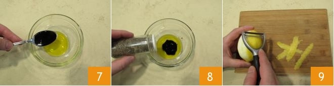 Bereiten Sie inzwischen die Sauce zum Würzen vor, indem Sie in einer kleinen Schüssel das Olivenöl zusammen mit dem Balsamico-Essig 7 gießen, Salz und Pfeffer hinzufügen 8 und dann mit einem Sparschäler oder einem Messer, wobei Sie darauf achten sollten, nicht den weißen Teil der Zitrone abzuschälen, der sehr bitter ist, die Zitronenschale abziehen 9.